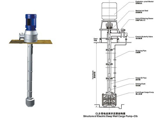 CLB型電動(dòng)深井泵由雙級(jí)離心泵、連接管及電機(jī)座,電機(jī)四大部件組成,電機(jī)座、電機(jī)安裝在甲板上,離心泵及連接管安裝在貨艙內(nèi),浸沒(méi)在貨物中,傳動(dòng)軸支承在滾動(dòng)軸承及特種塑料導(dǎo)軸承中,并通過(guò)彈性聯(lián)軸器與電機(jī)相聯(lián)接;傳動(dòng)軸的密 封采用機(jī)械密封結(jié)構(gòu),能適應(yīng)各種化工介質(zhì)的輸送要求。